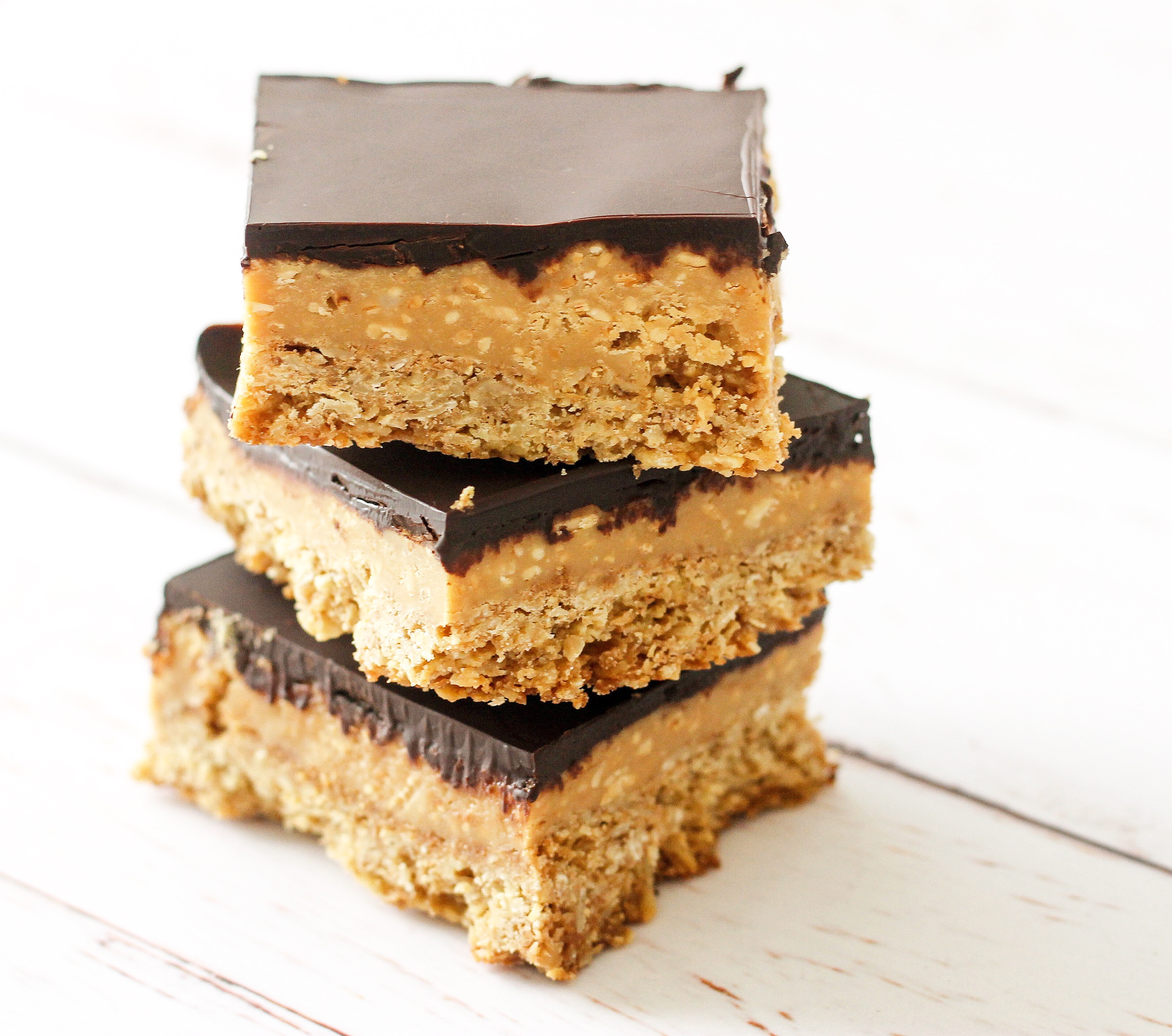 - Pour melted chocolate over peanut butter mixture and place in fridge for 2 hours or until set.