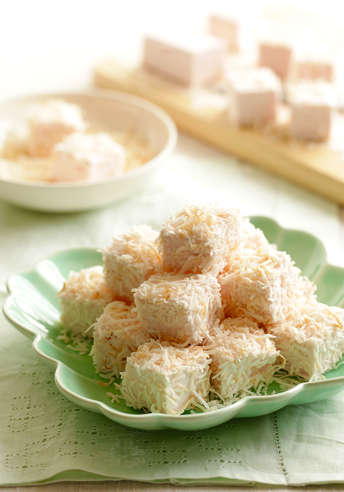 - Line a shallow dish with non-stick baking paper. Pour the marshmallow mixture into the dish, cover dish with plastic wrap and refrigerate overnight.