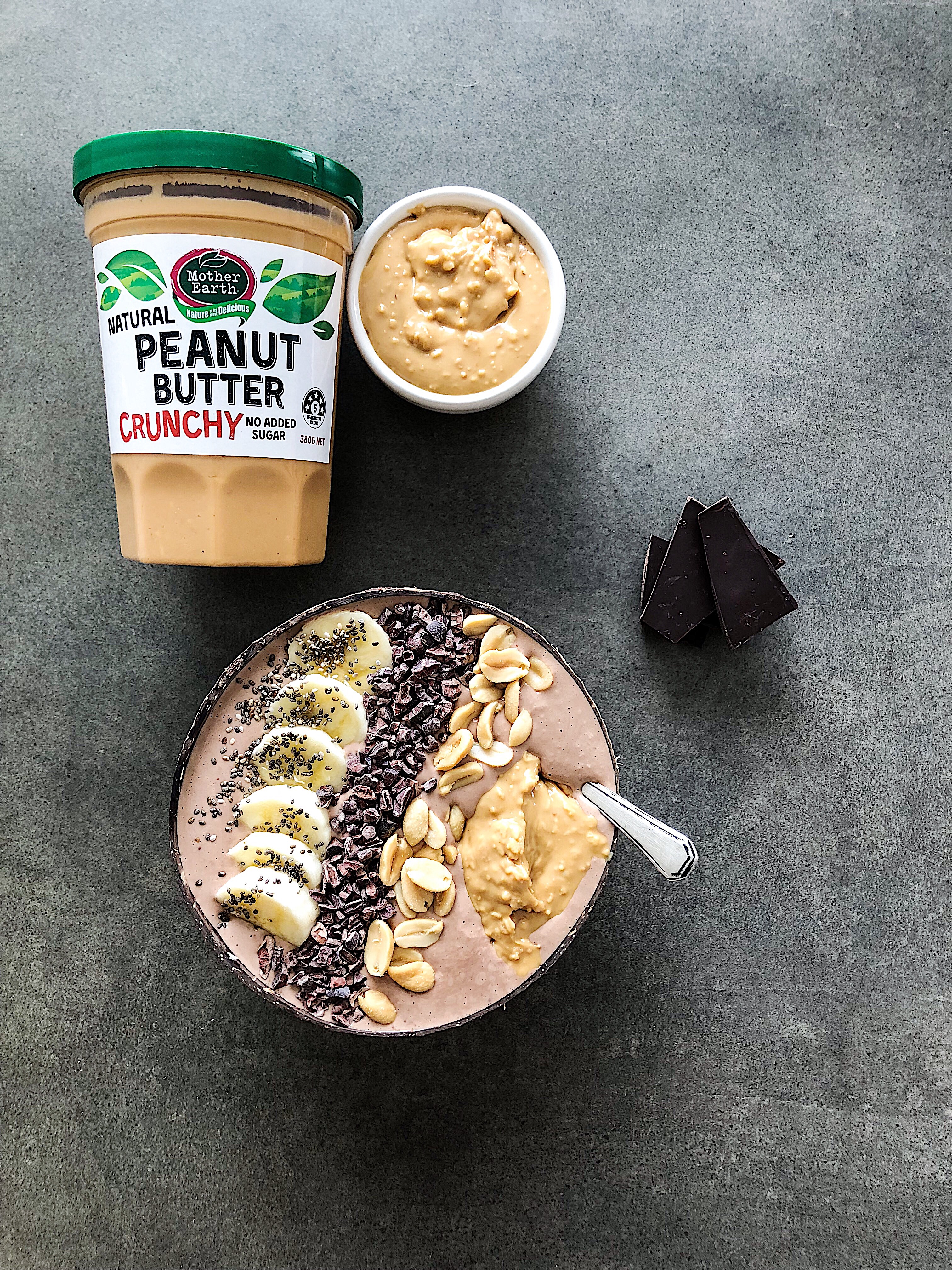 - Top with ½ banana, chia seeds, cacao nibs, peanuts and Mother Earth crunchy peanut butter.