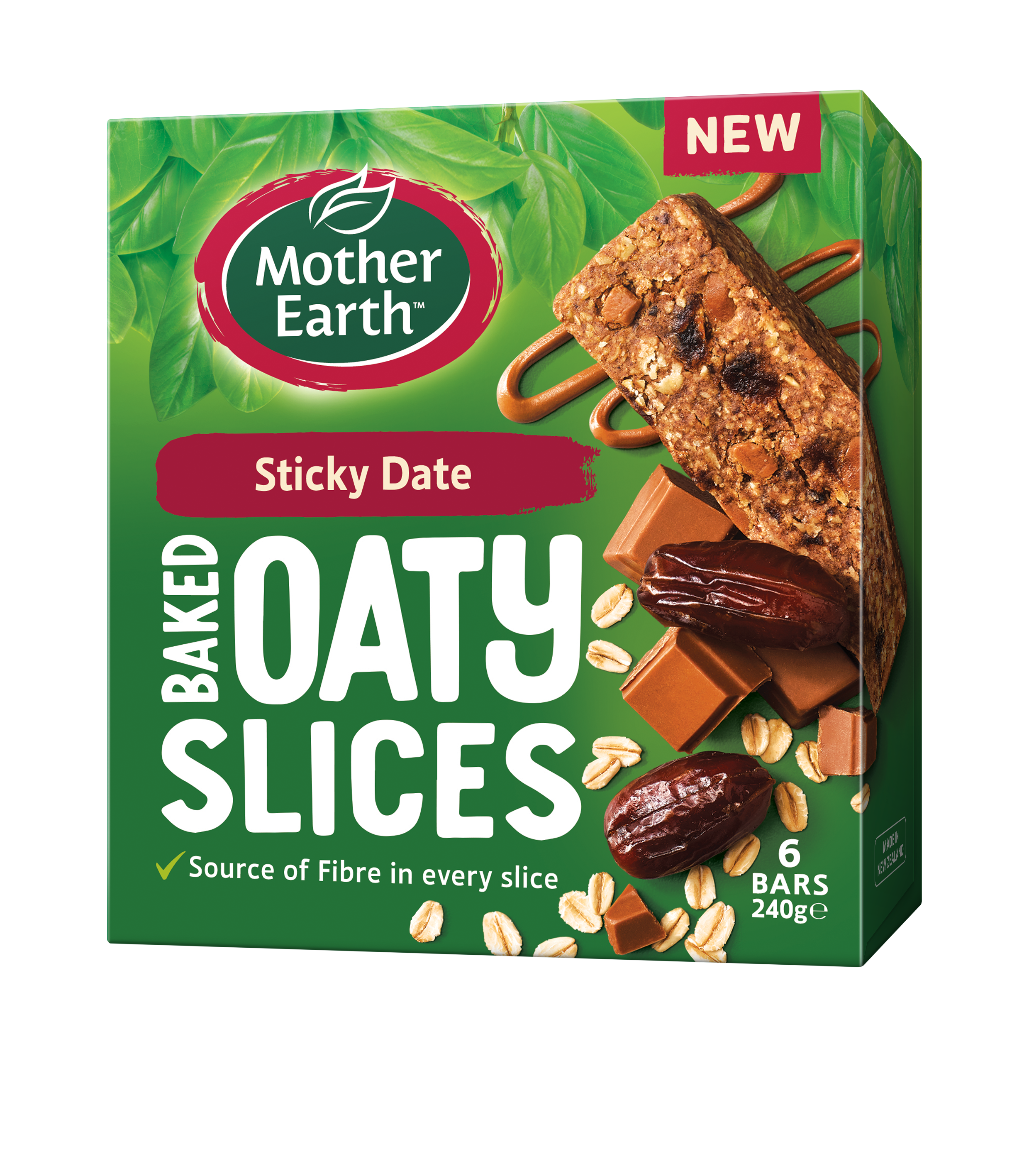 NEW Mother Earth Baked Oaty, Sticky Date. Dessert inspired using the goodness of oats, delicious real date pieces & delectable caramel chocolate in a soft baked bar.